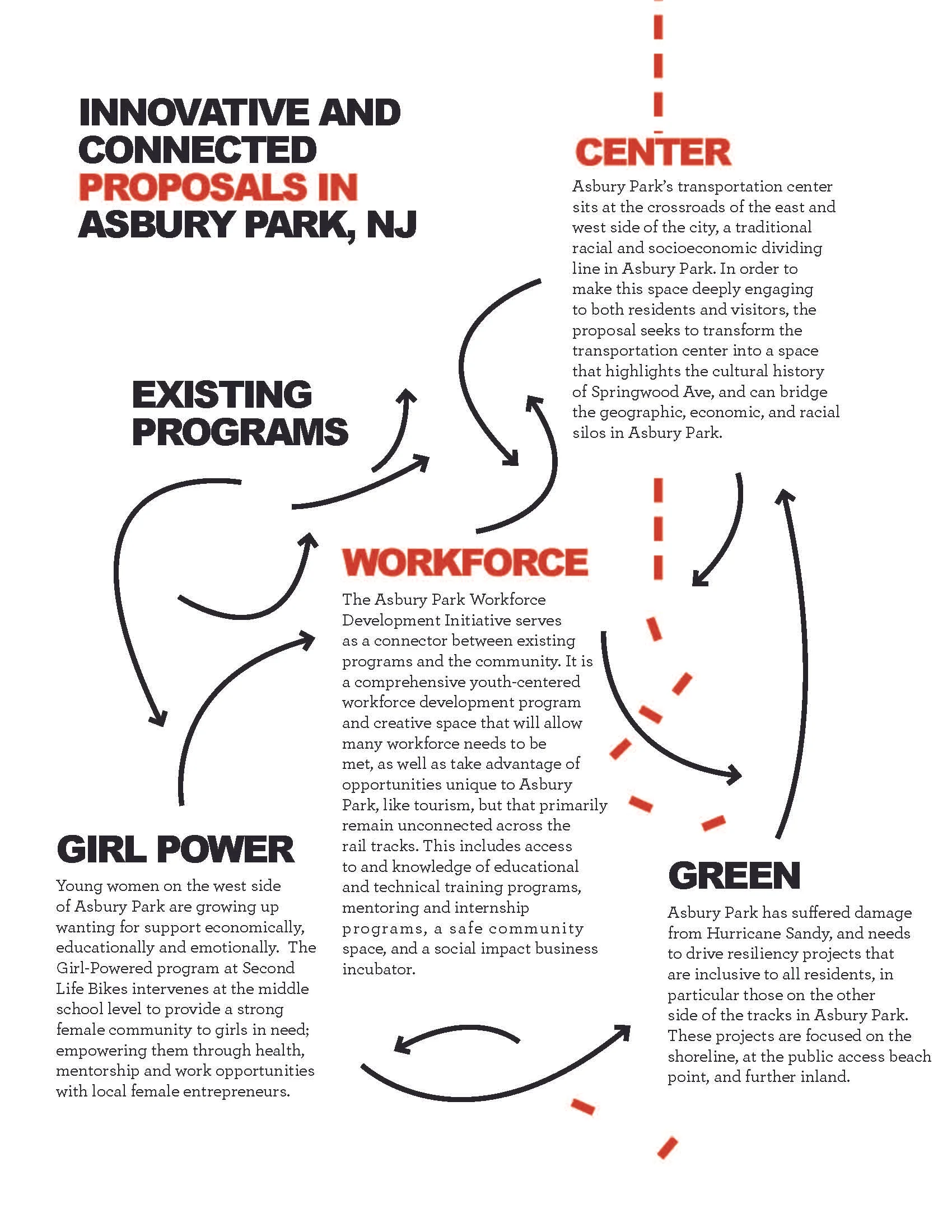 Asbury Park has deep and longstanding divisions in opportunity and wealth, split by a rail track, that began decades ago but still have not been undesigned today. Disinvestment, segregation and riots emptied Springwood Avenue of a strong local economy and music scene that never truly came back. We still face the uneven social structures that seem at times like immovable forces of nature. But they were deliberately created, and can be deliberately undone. With the right process in place, Asbury Park is positioned to be a leader in moving equitably and decisively into the twenty-first century. We need to create a process to co-generate value.